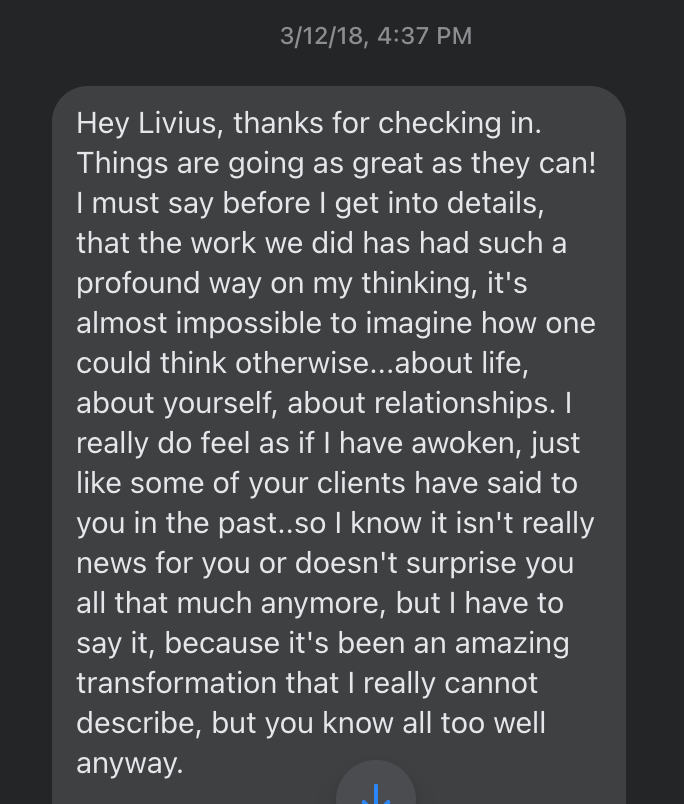 For many years, I was helping men overcome their insecure mindset in their love life. So they could finally access their ability to let joy guide them in their romantic life. And the transformations these men have had were beautiful to watch. Very inspiring and freeing for them. Even years later, some men still write to thank me occasionally for the work we did together.